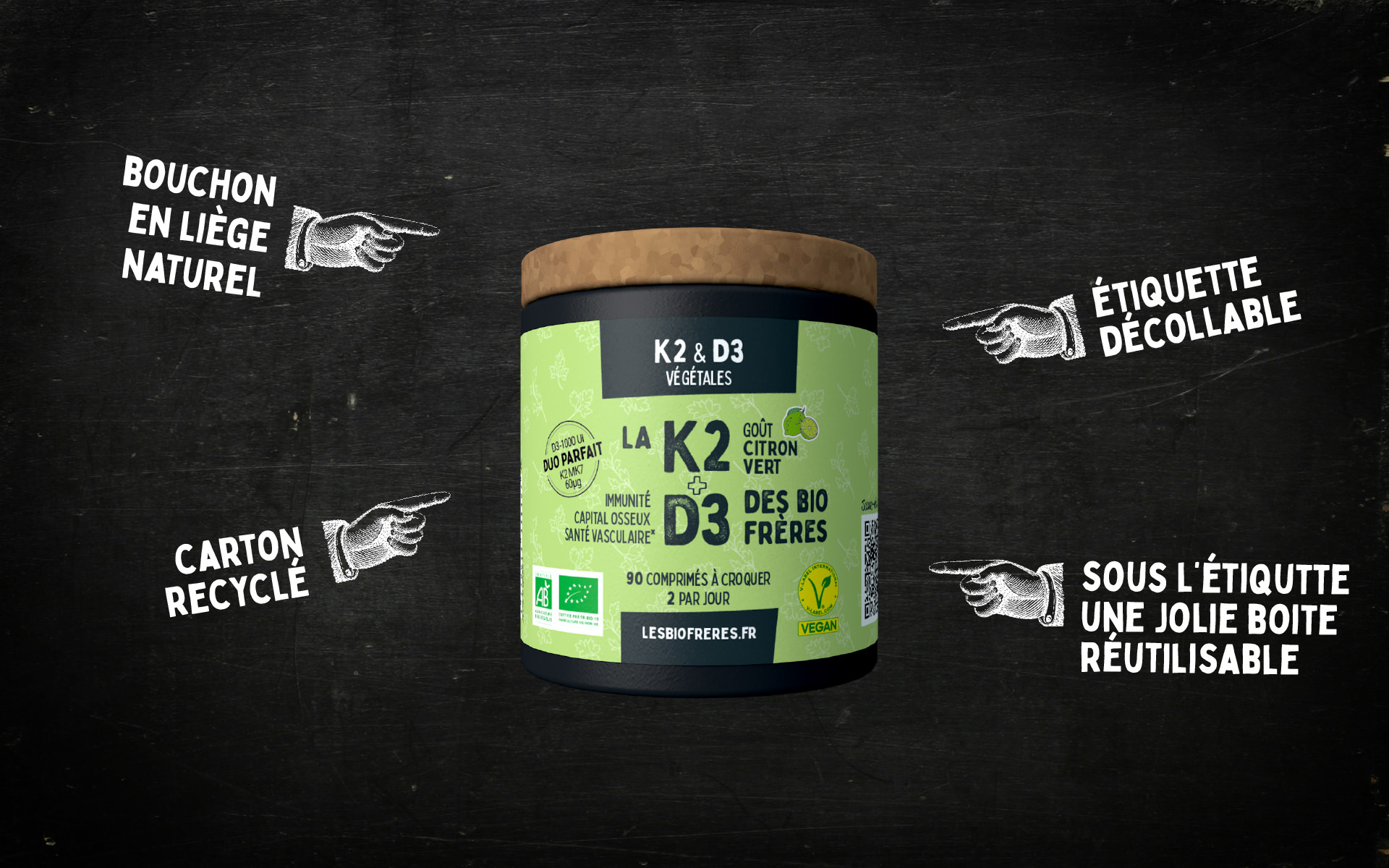 Pour contenir tout ça sans trop générer de déchets nous avons prévu un pilulier de 90 comprimés qui permet une complémentation en vitamine K2 & D3 de 45 jours.